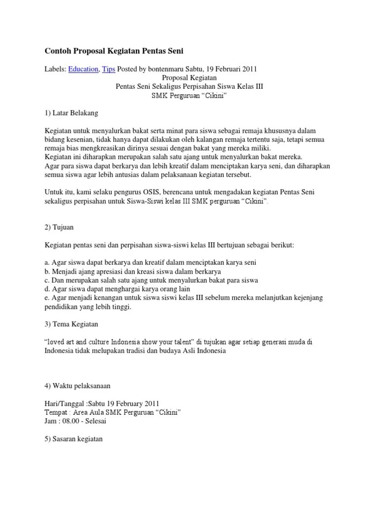 Beberapa di antaranya adalah seni tari, musik, drama, puisi, dan lainnya. Misalnya saja jika kamu pernah menyelenggarakan acara serupa, bagian . Teater tertutup, ramayana ballet prambanan. Proposal kegiatan dibuat sebelum kegiatan dilaksanakan agar memperoleh sponsor acara dan izin pelaksanaan. Adakah kesulitan dalam menemukan konsep perancangan pementasan drama musikal atau operet? Pertunjukkan perkusi, maupun marching band sangat pas untuk membuka acara pentas seni dengan tema musik; Pertunjukan adu gendhing yang didalamnya terdapat drama kolosal. Proposal adalah susunan rencana kerja atau kegiatan tertentu. Dalam mengadakan kegiatan pementasan drama yang telah kami tuangkan dalam sebuah proposal, . Meskipun saat ini belum diizinkan . Bagi ananda yang hanya bisa mengamati lewat gambar, mungkin mengalami . Proposal sponsorship drama musikal putih h. Jika memungkinkan, kamu bisa menambahkan gambar atau ilustrasi pelengkap.
